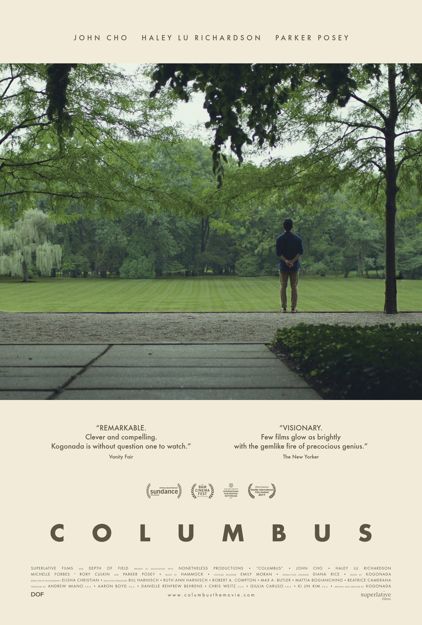 Mens hans fremmedgjorte far ligger i koma, er koreansk-fødte Jin tvunget til at opholde sig i Columbus, Indiana, kendt for sine mange modernistiske bygninger. Her opstår et venskab melle Jin og arkitektur-elskeren Casey, en ung kvinde fra det lokale bibliotek. Casey lever en skyggetilværelse og passer sin stofmisbrugende mor frem for at forfølge sine egne drømme. Sammen tager det umage par på opdagelsesrejse i Columbus mangfoldige modernisme. Med sin atmosfæriske stil og smukke tableauer indfletter Kogonadas spillefilmsdebut elegant byens arkitekturarv i historien. Columbus er en lyrisk meditation over åndelig rummelighed – og det at høre til og være menneske i dag.