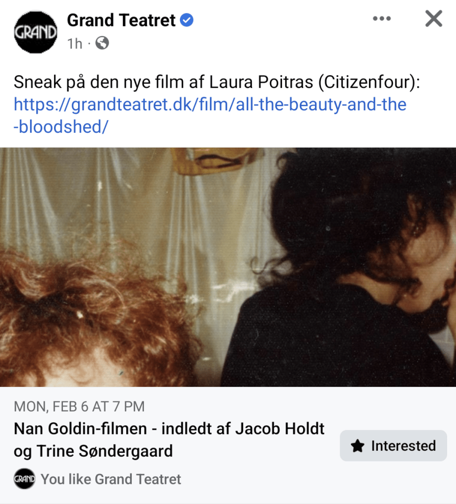 🇺🇸 BIOGRAF DOX: Mere end 100.000 amerikanere dør hvert år af en overdosis af narkotika eller medicin – ca. 75.000 af tilfældene er relateret til afhængighedsskabende smertestillende medicin, de såkaldte ‘opioids’. Årets Guldløvevinder fra Venedig tegner et intimt portræt af den kompromisløse fotokunstner Nan Goldin, der i dag kæmper aktivistisk for at medicinal-dynastiet The Sackler Family skal drages til ansvar for sin rolle i opioid-epidemien. Goldin brød igennem med sine hudløst autentiske fotografier af homoseksuelle og transkønnede subkulturer i Boston og New York i 70’erne og 80’erne og udstilles i dag på verdens førende museer som Guggenheim og Louvre. Museer som modtager klækkelige donationer fra Sackler-familien… Som én del smerteligt personlig og kunstnerisk øjenåbner om Goldins rejse fra en utryg barndom til et grænseløst kunstnerliv og én del fluen-på-væggen-skildring af Goldins indædte kamp mod Sackler-familien, formår filmen at forene en dybt personlig beretning og et altødelæggende samfundsproblem i en bevægende og menneskelig historie om familierelationer, misbrug, kærlighed og kunst. Se ALL THE BEAUTY AND THE BLOODSHED mandag den 6. februar kl. 19 i @grandteatret. [PR: REEL Pictures]