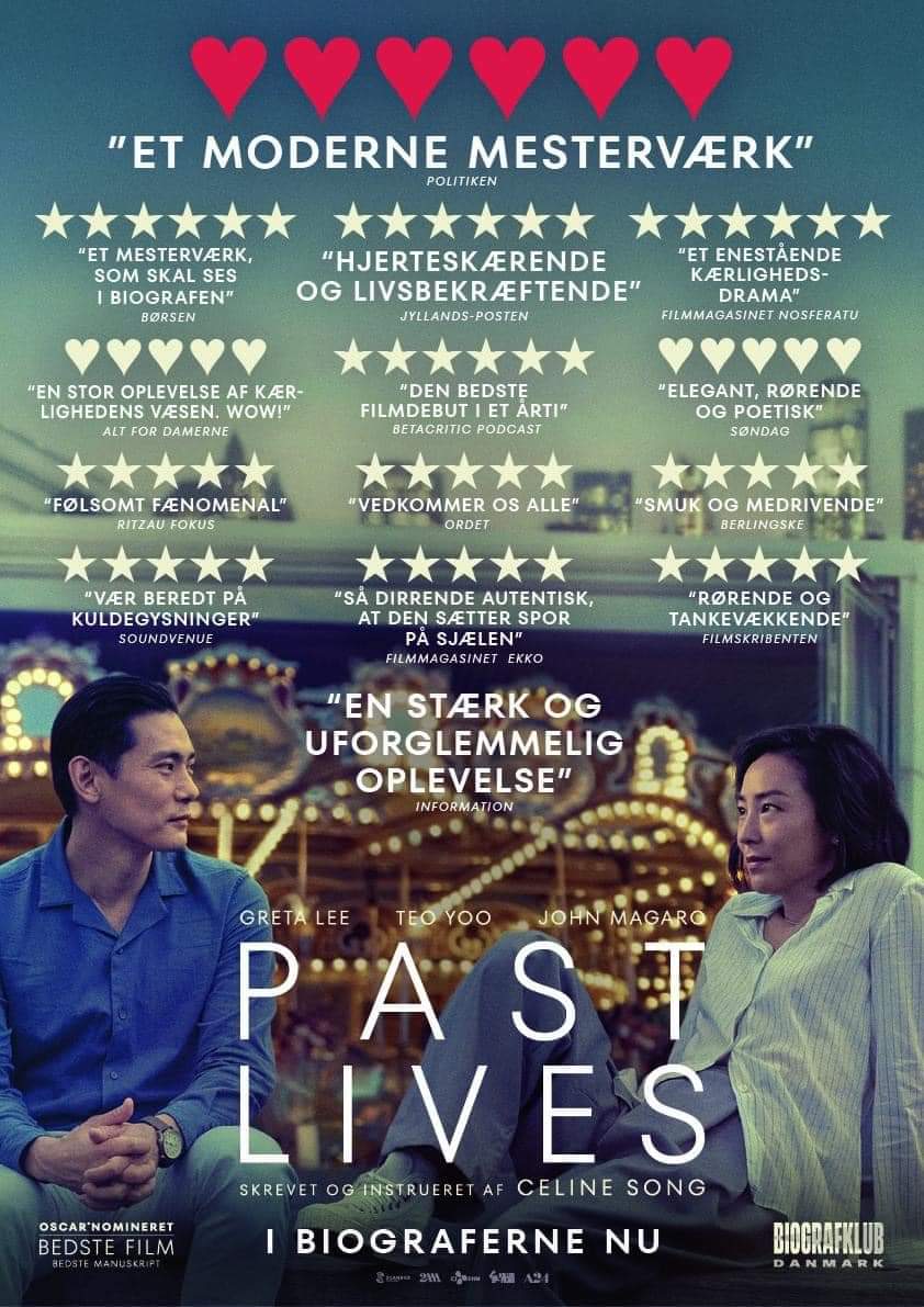 🇰🇷 Nora og Hae Sung, to dybt forbundne barndomsvenner, bliver revet fra hinanden, efter at Noras familie emigrerer fra Sydkorea. To årtier senere genforenes de i New York City i en skæbnesvanger uge, mens de konfronterer forestillinger om skæbne, kærlighed og de valg, der skaber et liv, i denne hjerteskærende, moderne, romantiske film. Instrueret af Celine Song. Premiere på Berlinale 2023. Dansk premiere den 21. marts.